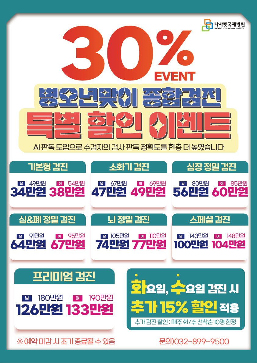 예약된 진료일정에 검사 또는 시술 예약이 함께 포함된 경우, 온라인으로는 예약 취소가 불가합니다. 일정 변경 또는 취소를 원하실 경우 대표전화 032-899-9999로 문의 부탁드립니다. 예약일에 내원이 어려우신 경우, 다른 분이 예약하실 수 있도록 미리 변경 부탁드립니다.
